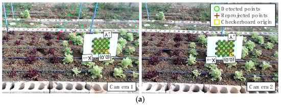 The major issue we try to deal with is how to superimpose IoT information associated with each physical object (e.g., plant, space) on the views of cameras. In this regard, the offline preparation stage is conducted to estimate the parameters of camera (i.e., extrinsic and intrinsic) to calculate the relative position and orientation between cameras, as well as to rectify the distorted images caused by lens distortion. However, to estimate these parameters, camera calibration is presented. The essential procedure of camera calibration is shown in Figure 6. The authors implemented a camera calibration by concentrating on the procedures of (A), (B), and (C), where (A) is the procedures of preparation: preparing the chessboard pattern, setting up the camera, and capturing the chessboard pattern images. Then, the captured image is added to (B). After the calibration, (C) is therefore adopted to evaluate the accuracy of calibration. The procedure of (D) is needed if the evaluation gives a pessimistically high value of the overall mean reprojection error. The software used for performing the calibration procedure is the toolbox of MATLAB [28], and we assumed that the cameras are calibrated (see Figure 7 and Figure 8) and that their images are rectified, as shown in Figure 9.
