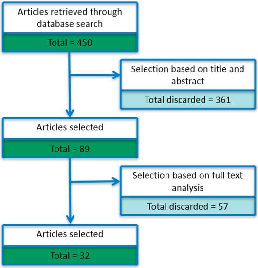As illustrated in Figure 1, following the above guideline and considering articles published from 1994 to 31/12/2018, we obtained 450 articles. A selection based on analysis of the title and abstract reading lead us to a restricted set of 89 articles, which became 32 after a full text analysis: 30 papers in scientific journals and 2 conference papers.
