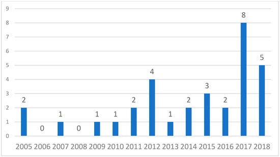 We ordered articles included in the review by year to have a view of how the interest around this concept is developing (Silvius et al. (2019) had been indexed in Scopus since 2018 and published in 2019; we included it in the 2018 cluster). Indeed, Figure 2 shows a positive trend during the past few years with a peak on 2017; this underlines the increasing academic interest in the integration between sustainability and project management. This trend reflects the growing relevance of sustainability for organizations and firms, and is consistent with the trends found in other systematic literature reviews on sustainability within specific business domains, such as innovation or marketing [23,24].