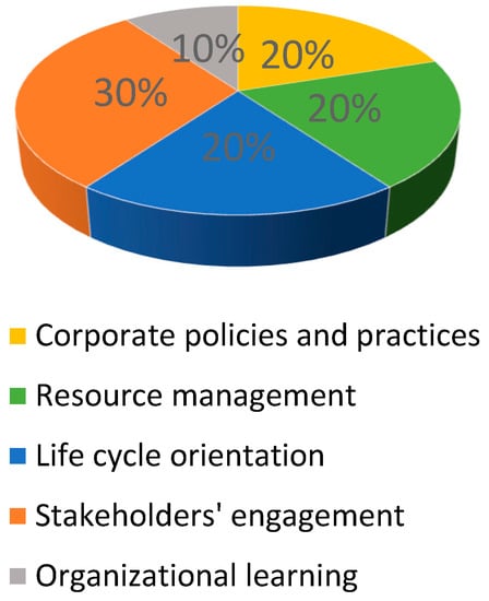 Table 1 shows that the dimensions that were first investigated were corporate policies and practices and life cycle orientation, as the first contributions appeared in 2005. The most investigated dimension (in terms of number of papers, i.e., 12 papers) was stakeholders’ engagement, as can be also seen from Figure 3, which shows the share of papers for each domain.