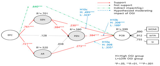 To assess the proposed moderating impact of overall green image (OGI), a test for metric invariance was conducted. In this case, a continuous variable—such as an interval scale or ratio scale—was used as a control variable to evaluate a metric variable. The sample was divided into high (n = 322) and low (n = 207) overall image groups through K-mean cluster analysis. Since the significance probability for the nested model was 0.152, which exceeds the significance level of 0.05, OGI was found to have an effect. Moreover, the baseline model showed an acceptable level for data suitability (goodness-of-fit statistics for the baseline model: χ2 = 409.868, df = 192, p < 0.001, χ2/df = 2.135, RMSEA = 0.046, CFI = 0.953, IFI = 0.954, TLI = 0.942). The details are shown in Table 4 and Figure 1. The chi-square test results with measurement invariance revealed that the path from AR to pro-environmental customer behavioral intentions (PCBI) for coffee shop practices was not significantly different between groups (Δχ2 = 0.199, p > 0.05). However, while the ascription of the responsibility (AR)–PCBI link for the low-OGI group (β = 0.335, p < 0.05) was significant, the AR–PCBI path for the high-OGI group was not significant. Thus, the chi-square test results did not differ significantly across groups; thus, H10a was supported. The study’s findings also indicated that, although the relationship between personal environmental norm (PEN) and PCBI differed significantly between the high (β = 0.306, p < 0.001) and low (β = 0.189, p < 0.05) OGI groups, there was no significant difference in the PEN–PCBI link (Δχ2 = 0.402, p > 0.05); thus, H10b was not supported. Moreover, the study uncovered that the SEN–PCBI link was significantly different between the high- (β = 0.495, p < 0.001) and low (β = 0.324, p < 0.05) OGI groups, but that there was no significant difference in the SEN–PCBI link (Δχ2 = 2.501, p > 0.05); thus, H10c was not supported.