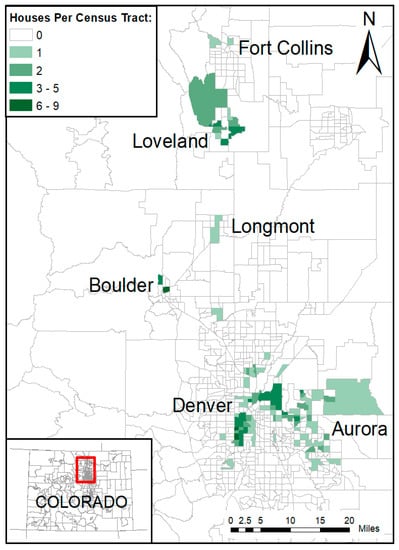 The structural and envelope construction materials used in the study homes were primarily wood in the majority of homes (with concrete basement floors and basement walls) with less than one-quarter of the homes built with brick-masonry walls or a combination of wood and brick-masonry walls. Figure 1 shows the spatial distribution of homes recruited for the CHEER study, which ranged from 1600 m to 1770 m above sea level in the International Energy Conservation Code climate zone 5 dry (B) region [62]. The EER and non-EER homes were evenly distributed across all census tracts. Built green homes were located only in the Boulder and Loveland areas.