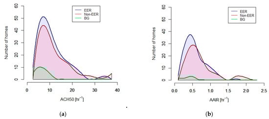 Although statistically different means in both ACH50 and AAIR were observed for the different building types, and the median AAIR of the EER homes was 17% lower than that of the non-EER homes (Table 2), the overall distribution patterns of EER and non-EER homes were similar (Figure 2).