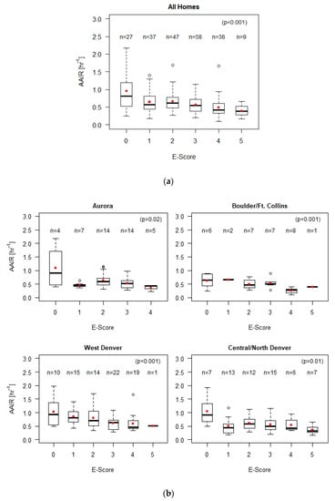 A negative relationship was found between E-score and AAIR (Figure 3a). AAIR distributions had higher medians in most cases for E-scores of zero, compared to the median AAIRs in non-zero E-score categories. The changes in AAIR when the E-scores increased sequentially from one to five, however, were not monotonic in nature, and depended on the location of the homes (Figure 3b).