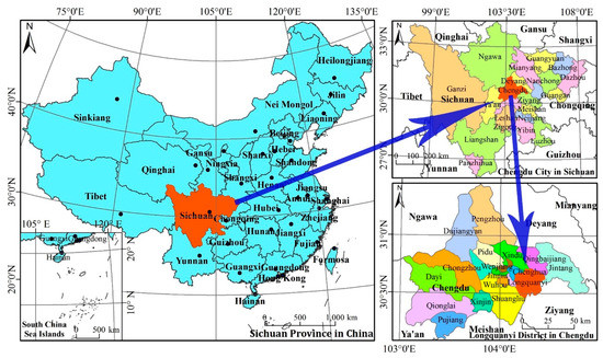 Longquanyi District is the main eastern urban development area in Chengdu City and the location of the National Economic and Technological Development Zone. We selected this district as the study area (Figure 1) because of its high representativeness and research value for LPOA. This area has also been affected by series of ecological and environmental problems during the process of industrialization and urbanization. The area is located in the central section of Sichuan Province, to the east edge of Chengdu Plain and the west side of Longquan Mountain. Geographically, this district is located between 104°08′19″ E–104°27′09″ E and 30°27′52″ N–30°43′23″ N, at 12 km from the center of Chengdu City and it has the typical characteristics of a suburban area in a metropolis. The total area of the entire district is 556.4 km2. The geological structure comprises a structural fault block between the Chengdu fault depression belt and the Longquan Mountain uplift fold belt. The characteristic terrain is high in the southeast but low in the northwest. The highest elevation is 1037 m, the lowest elevation is 407 m, and the relative elevation is 630 m. The geomorphic types mainly include plains, hills, and mountains, where the plains are piedmont alluvial dam distributed in the mid-west of the district, mountains are present with a northeast-southwest alignment in the southeast of the district, and the hills are distributed in the west of the district to the east and west sides of the middle section of Longquan Mountain. The regional climate type is subtropical humid in the Sichuan Basin. The mean annual temperature = 16.5 °C, precipitation = 852.4 mm, sunshine duration = 1021 h, and evaporation capacity = 984.7 mm. The soil types mainly comprise rice soil, yellow soil, purple alluvial soil, and purple soil. The forest vegetation type is subtropical evergreen broad-leaved forest and the major vegetation is natural secondary forest and plantation.