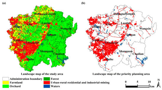 In this study, the data imported into the model had two formats: spatial data and nonspatial data. During spatial data processing, the landscape type was classified into six categories (farmland, orchard, forest, urban-rural residential and industrial-mining, and waters) using the quick unbiased efficient statistical tree (QUEST) classification based on the Landsat OLI image from 2014, GDEM V2 data, the current land use status map, and the landscape field survey results, where the overall classification accuracy was 95.94% and it was sufficient for the purposes of this study []. We then obtained the landscape map of the study area (Figure 2a) and landscape maps of the priority planning area (Figure 2b) in the study area. Furthermore, derivative data such as the slope, aspect, and hypsography degree were obtained based on calculations using GDEM V2 data. Environmental data related to the soil organic matter content, average annual rainfall, and average annual temperature were obtained by spatial interpolation using ESRI ArcGIS 10.0. Neighborhood factors including the nearest distances to the city center, town center, major roads, and waters were calculated using a Euclidean distance tool based on related data such as the city center, administrative center of each town, major roads, and waters derived from the landscape map in 2014 with ESRI ArcGIS. In addition, socioeconomic data such as the population density and per capita GDP were calculated according to relevant sources, including the administrative district area, population, and GDP statistical data, before they were converted into grid data with the vector-raster conversion function in ESRI ArcGIS. In order to implement the models, all of the spatial data were converted into grid data format at 30 m resolution using the Xi’an 1980 coordinate system and the Gauss–Kruger projection. During nonspatial data processing, nonspatial data were collected for the study area, including natural status data and socioeconomic statistical data, which were used to establish the NP models to conduct the LPQSO.