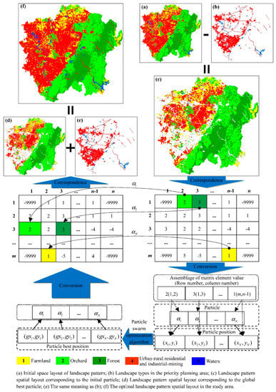 Third, during the establishment of the spatial mapping relationship between the landscape type raster graphics and particles, we first set the code value of landscape type in the priority planning area as negative values (e.g., setting the code value for urban-rural residential and industrial-mining as −4 or setting the code value for waters as −5), and encode the landscape type code values in other areas as positive values (e.g., setting the code values for farmland, orchard, forest, urban-rural residential and industrial-mining, and waters as 1, 2, 3, 4, and 5, respectively). We then define the elements with codes that have positive values as the valid elements and store them as vector quantity data structures denoting a particle, whereas we define the elements with codes that have negative and null values as invalid elements that do not map to particles, i.e., the invalid elements will not participate in the optimization allocation for the spatial locations. Thus, after each iterative computation of the particles, we amalgamate the landscape pattern spatial layout corresponding to the invalid elements in the priority planning area with the landscape pattern spatial layout searched for by the flight of the particles, and then calculate the particle fitness based on the merged spatial layout to obtain the optimal scheme of LPOA for the entire area. Therefore, this approach allows the effective combination of the spatial optimization model and macroscopic factors, such as society, economy, policy, and system factors, as well as successfully addressing the problem of coupling macroscopic factors that affect the landscape pattern with the spatial optimization model.