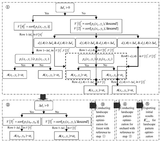 where, are the row and column values, and the corresponding suitability values of valid elements for farmland, orchard, forest, urban-rural residential and industrial-mining, and waters landscapes, respectively; are the row and column numbers for farmland, orchard, forest, urban-rural residential and industrial-mining, and waters landscapes in matrix , respectively; and are the suitability values for landscape type corresponding to the elements of farmland, orchard, forest, urban-rural residential and industrial-mining, and waters landscapes, respectively.