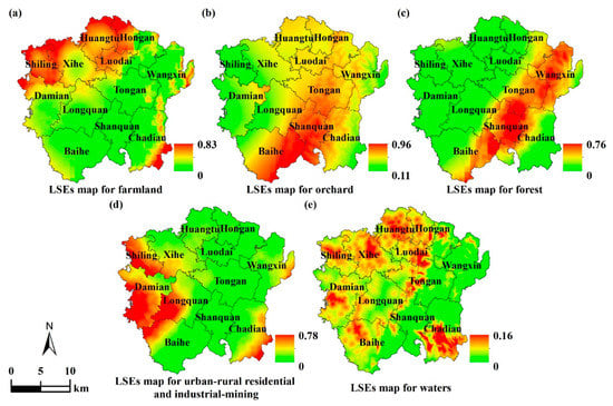 Using the indexes mentioned above and ESRI ArcGIS, we implemented the LSE model of the study area as follows. First, we extracted farmland, orchard, forest, urban-rural residential and industrial-mining, and waters landscape maps from the landscape map of the study area for the year 2014. The locations in the grids where landscape was present were assigned values of 1; otherwise, the grid locations were assigned values of 0. Second, we extracted the grid values from each landscape type map and the corresponding spatial distribution raster graphics for various evaluation indexes, and we then used these extracted grid values to determine each landscape pattern influence index and the corresponding regression coefficients by using stepwise regression for BLR analysis with SPSS software. Finally, we calculated the probability map for each landscape type spatial distribution, i.e., a suitability map for each landscape type spatial distribution, according to Equation (1) by Python programming based on the effect indexes and the corresponding regression coefficients for each landscape type.
