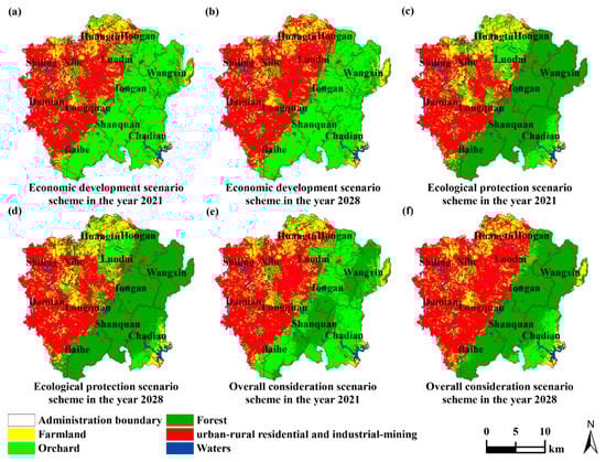 In this study, the LPQSO models for the economic development, ecological protection, and overall consideration scenarios were implemented by MATLAB programming using the solution function FMINCON for the constraint optimization problem in the MATLAB optimization toolbox. We then determined the optimal areas for various landscape types under each scenario in the target years.