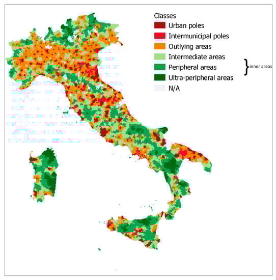 Being aware of this, our aim is to provide some insights on the effect of a discrete recessionary disturbance on areas that have been challenged by slow-burn pressures over a time span of almost seven decades (since the 1950s). Concerning the spatial units of our analysis, we relied on the classification produced by the National Strategy for Inner Areas (SNAI), which was launched by the Italian Minister for Economic Development in 2014. This allows us to focus on clearly identified areas that are very likely to have undergone negative path-dependence processes, locking them into a socio-economic decline. As stated in the official document of the strategy [41], many inner areas have faced a reduction in the man-made environments because of aging, depopulation [28,42,43,44,45,46], dwindling employment and use of territorial capital, coupled with a progressive decline in offers of local public and private services. Inner areas are interpreted as areas located at a considerable distance from centers providing essential services (namely education, health and transport). Methodologically, “service provision centers” were identified as those municipalities (A: urban poles of attraction) or groups of neighboring municipalities (B: intermunicipal poles of attraction) able to simultaneously provide a full range of secondary education, at least one emergency care hospital and at least one railway station providing metropolitan/regional journeys. The identification of these centers was followed by the classification of the remaining municipalities into four bands: (C) outlying areas; (D) intermediate areas; (E) peripheral areas and (F) ultra-peripheral areas. This was carried out using an accessibility indicator in terms of the number of minutes taken to get to the nearest hub. The bands were defined based on distribution of the distance in minutes: <20 min for outlying areas (C); 20–40 min for intermediate areas (D); 40–75 for peripheral areas (E) and >75 for ultra-peripheral areas (F). The last three classes (D, E and F) are labeled “inner areas” (see Figure 1).