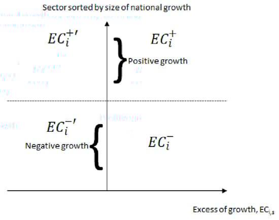 If we divide the excess of change according to sectoral national growth, we take the null sector, s0, as the benchmark (see Figure 2) to obtain four different areas: