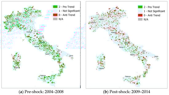 Figure 3 illustrates the geographical distribution of pro-trend, not-significant and anti-trend municipalities in the two sub-periods we identified: (a) pre-shock (2004–2008), and (b) post-shock (2009–2014).