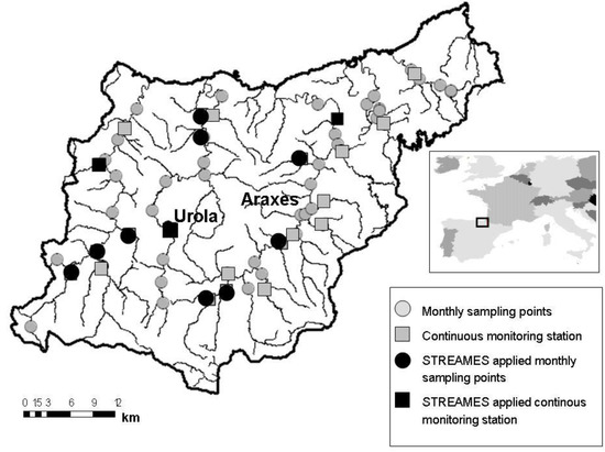 For each section, STREAMES 1.0 requires information on hydrology and water quality, channel morphology, in-stream habitat, riparian vegetation and catchment characteristics including presence of point-source inputs. Data on discharge and water quality (pH and electric conductivity, concentrations of oxygen, ammonium, nitrate and soluble reactive phosphorus, turbidity and total suspended solids, biological and chemical oxygen demands) were provided by the Province Government. Catchment characteristics (area of the drainage basin, lithology and soil uses) were calculated with ArcView 9.3 on the digital maps of the Province Government (https://b5m.gipuzkoa.eus/). The presence of free-ranging livestock and of gravel extraction was checked with the managers and rangers from the Province Government. The rest of the information needed to run STREAMES was collected in visual inspections of 100–500 m reaches upstream from each point. Therefore, we assessed the structure of riparian vegetation, the abundance of modifications of river channel and banks, the dominant type of substrate, the proportion of riverbed covered by fine sediments, the presence of filamentous green algae, macrophytes, as well as sewage fungus. Finally, the Province Government provided information on biological indicators based on algae, invertebrate and fish.