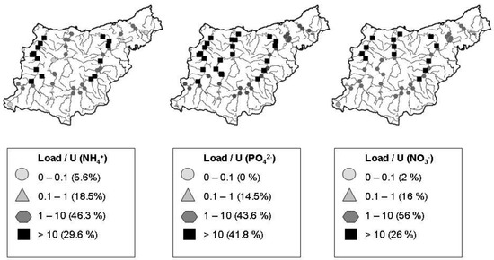 We calculated the ratio between nutrient load and potential nutrient uptake rate to estimate the potential importance of in-stream processes in controlling nutrient dynamics at the scale of river sections (ca. km-long). For this purpose, nutrient loads were expressed in units of mg s−1 m−2 by dividing average annual load by the areal surface of 1-km stream sections (i.e., section length by wetted width).