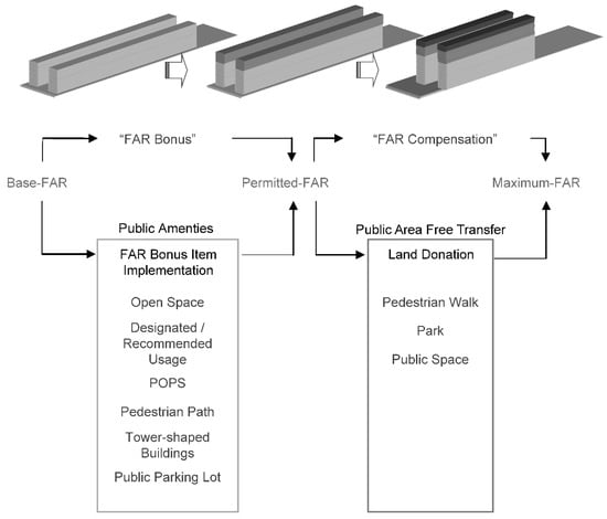 The current FAR bonus system can be distinguished into three major stages, as follows: Base-FAR, Permitted-FAR, and Maximum-FAR. Among the various bonus categories are those regarding development site parcels, building usage, privately owned public space (POPS), etc. According to the given conditions of the subject area, the degree of bonus provision can be distinguished as “regulatory” or “recommended.” When the FAR modulation requisites for POPS, pedestrian path, tower-shaped buildings, and others are fulfilled, incentives are added to the Base-FAR to get the Permitted-FAR and a land donation related FAR-bonus is added when appropriate. Figure 1 presents the FAR incentive scheme, showing public amenities and contribution items.