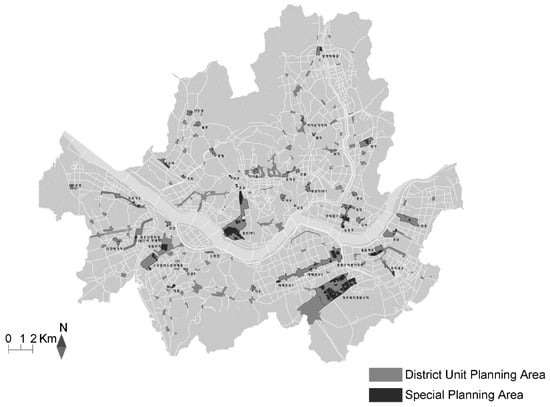 Seoul has the greatest number of district unit plans in Korea. Since 2007, a total of 201 district classifications and 71 detailed development plans have been confirmed. For investigating actual conditions of incentive provisions, this research examined 46 special planning projects (for a total of 1,140,344 m2) that were initiated since 2000, the year when special planning projects were established within District Unit Planning. Figure 2 presents the research subject areas. The dark grey color depicts the distinct planning areas, while the black color depicts the special planning areas, which are the intensive study areas.