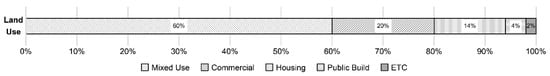 On investigating special planning area, buildings whose construction was completed after the year 2000, 27 out of 51 districts (~53%) were found to be up zoned. Among the 27, three were up zoned in two stages, for instance, from housing to commercial use. Looking at the main uses, it was observed that 31 were mixed-use and 6 were multi-unit housing. Hence, 37 out of 51 were developed as residential use. Furthermore, among the 27 up zoned districts, 23 (~85.2%) were developed as multi-unit housing, implying that developmental emphasis was on residential facilities. Figure 3 shows the current situation of land use. After the development, the use is biased toward the semi-residential complex area.