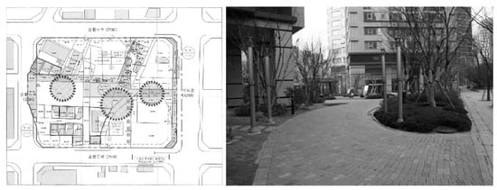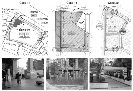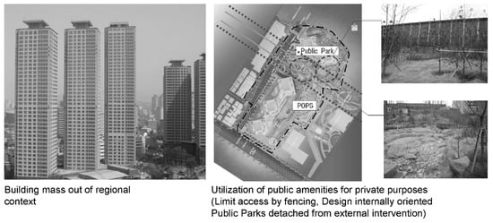 The reason for such emphasis on residential development within special planning districts can be attributed to excessive advantages granted for residential developments and intents of up zoning. At the time of development, the local governments actively supported private development to promote regional development. In that process, the local governments actively utilized the FAR bonus and allowed for changing the existing residential areas into quasi-residential areas. That is, the heads of local governments provided development merits to private business operators and up-regulated use zoning, leading to the dominance of the development of residential complexes. More specifically, Seoul’s regulations allow mixed-use buildings only in semi-residential areas and higher; thereby, private developers can secure a commercially profitable building density. Therefore, special planning areas designated as semi-residential development areas can be regarded as appropriate for pursuing mixed-use building constructions. However, there is evidence of adverse effects. The excessive real-estate development focused on residential-oriented mixed-use buildings resulted in the creation of a building mass that was unsuitable in the regional context, as well as in privatization of public space. Figure 4 presents examples of public facilities secured by private development that is not aligned with the public objectives.