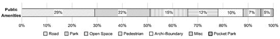Among the public amenities secured through the FAR bonus, those donated to the public as parks and roadways amount to 144,066 m2 and spaces opened to public without transfer of ownership, such as open public spaces and pocket parks amount to 101,876 m2. Consequently, a total of 245,942 m2 of land was apparently acquired and developed, through special planning districts, as public space. This implies that more than 19% of the total area has been secured as public open space via incentive zoning. Such public facility land acquisition is the most significant benefit to the public by using the FAR bonus system. Figure 5 presents the quantum of public facilities built through incentive zoning technique, an aspect of the urban planning policy. Although it was a private development project, it secured more than 70,000 m2 of urban infrastructure, such as roads, more than 100,000 m2 public parks, such as parks and POPS, and more than 70,000 m2 of public open spaces, such as public walkways.