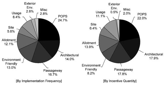A compendium of survey results showed that categories with the highest frequencies were those under “POPS”, “Architectural”, and “Pedestrian Path”, constituting a total of 55.3%. Such lopsidedness can be attributed to three main reasons. First, these categories are prerequisites that must be fulfilled as part of the general construction project. Second, they require only minimal additions and adjustments to the standard building codes. Last, considering the associated expenses and the conveniences, they are very favorable to the developers.