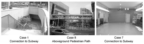 Low frequencies are observed in above/underground passageway. This may be attributed to the limitations imposed according to different regions’ specifications. Areas in the vicinity of transit stations demonstrate this challenge. A pedestrian path connecting directly to a subway station or an aboveground passageway that connects buildings on the upper level via a sky pass produced debatable questions. Public accessibility of such a passageway is uncertain, because most passage decks are constructed to function as a direct connection to the building itself and, hence, its users are almost exclusively limited to the building occupants. Figure 9 shows the existing condition of public walkways. Case 8 is controversial because it functions as a passage directly connected to the commercial building and its public use can be disputed.