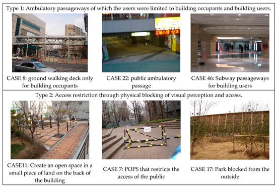 Public facilities that have been installed to receive incentives should serve many individuals, in light of the purpose of the facilities. That is, if there are plan elements or intentions that limit the use, then obstacles have occurred in demonstrating publicness. Therefore, public facilities installed to obtain incentives must meet three conditions, as follows: (1) External users should be included, (2) there should be no visual or physical obstacles, and (3) the facilities satisfy prerequisites for the exhibition of publicness. The relevant resources in the specially planned area were investigated with the three viewpoints, as such, and the representative facilities with conditions that make the exhibition of publicness difficult are classified as shown in Figure 11.