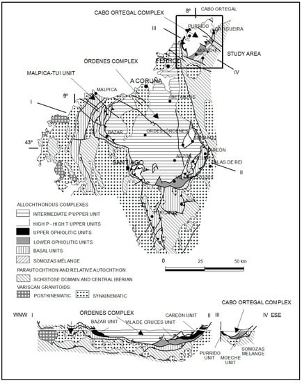 The study area is located in the NW of Spain and belongs to the Cabo Ortegal Complex, one of the five allochthonous complexes outcropping in the NW of the Iberian Massif and framed within a context of collision between Gondwana and Laurasia [22,23,24,25] (Figure 1).