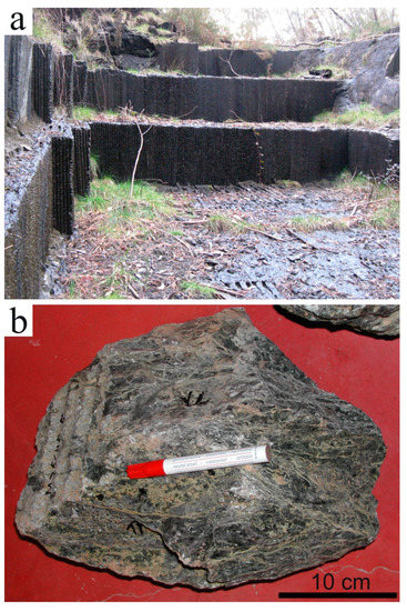 (a) Abandoned quarry in Monte Ferrerías (Moeche) where sampling was carried out. The high of quarry beds is around 1 m; (b) serpentinite block sample from the same quarry.