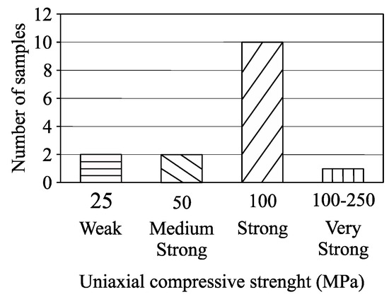 According to the Reference [39] classification for the uniaxial compression strength in rocks (Figure 3), the samples were classified in groups that included weak to very strong rocks, with most of the samples being classified as strong (50–100 MPa). In most cases, the relative Es/UCS ratio [40] was medium, although occasionally the ratios were high.