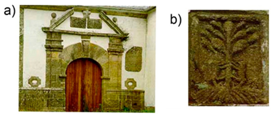 Details of the use of the carbonated serpentinite (Pedra de Toelo or Pedra de Moeche) in the architectural heritage of Galicia. This stone can be found in monuments and historical buildings from the Middle Ages. (a) Door lintels, and other architectonic ornaments in the façade of Labacengos church, in Moeche (16th century); (b) coat of arms of the Monastery of Oseira (oso means bear in Spanish).