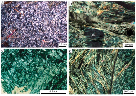 Figure 5. Textures found in the Moeche serpentinites (Crossed Nichols): (a) Mesh texture (M-8c); (b) bastite (Ba) (M-3b); (c) thorn texture beginning to recrystallize on bastite (M-2d); (d) fibrous serpentine (possibly chrysotile) (M-10a). - Bastite texture. Serpentine mineral aggregates elongated and with similar orientation. This is a serpentine that has replaced old pyroxenes, and in these cases, the presence of oriented magnetite following pyroxene exfoliation surfaces is quite frequent (Figure 5b).