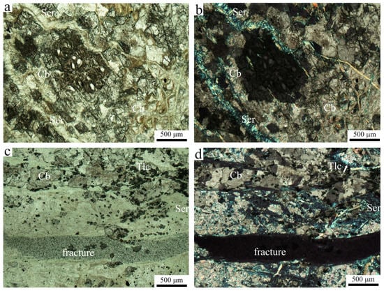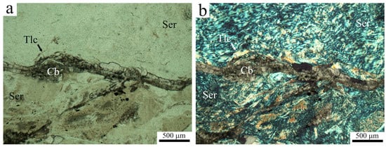 The microscopic aspect of a nodulous sample, not foliated, with serpentine minerals, talc and carbonates, the latter filling a fracture. (a) Parallel Nichols and (b) Crossed Nichols. Sample M-2d. Ser: Serpentine; Cb: Carbonates; Tlc: Talc.