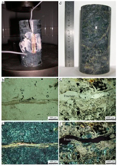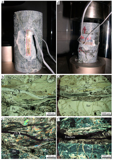 In moderately strong samples, the foliation was not as penetrating as in the weak samples, but was more regular (Figure 9a–c). Unlike the weak specimens, the fractures sometimes passed through areas where carbonate recrystallization had occurred (Figure 9d–f).
