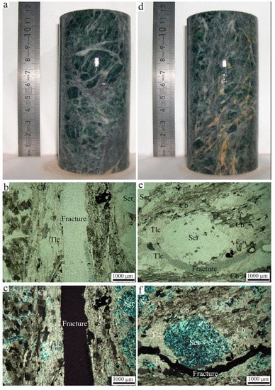 Fractured medium-strong rock samples. Left (a–c): Sample M-10a (UCS = 35.1 MPa) with the failure following the serpentinite foliation in a specimen with few previous fractures. (a) Sample after UCS testing; (b) Parallel Nichols, and (c) Crossed Nichols. Right (d–f): Sample M-8d (UCS = 35.8 MPa) with the fracture following the foliation, defined by intense carbonation and relevant talc contents; (d) Sample before testing; (e) Parallel Nichols, and (f) Crossed Nichols. Ser: Serpentine; Tlc: Talc.