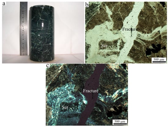 The fractured very strong rock sample. Sample M-2d (UCS = 119.6 MPa). The failure surface does not follow previous discontinuities. (a) Sample before testing, (b) Parallel Nichols, and (c) Crossed Nichols are shown. Ser: Serpentine.