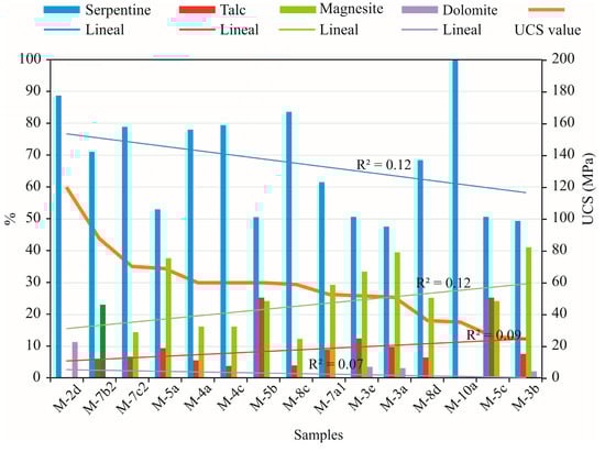 Mineralogy of the Moeche serpentinites according to the semiquantitative results obtained in the XRD analyses. Samples are organized from left to right according to their UCS (MPa). Straight lines represent the linear correlation between each mineral and its UCS.