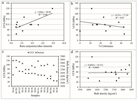 Correlation between UCS and some of the parameters studied: (a) UCS and serpentine/other minerals ratio; (b) UCS and % carbonates; (c) UCS and density bulk for each sample, from the highest value (left) to the lowest (right); (d) UCS test and bulk density.