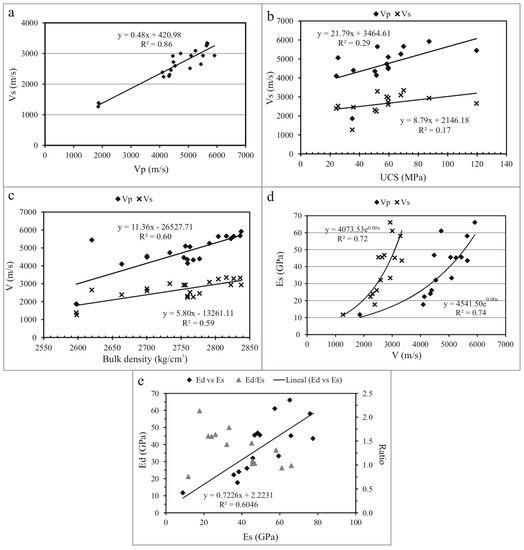 Other correlations considered in other works are related to the propagation velocities of ultrasonic waves. VP and VS correlate well with each other (Figure 14a), but do not correlate well with the mechanical properties obtained from the uniaxial compression tests. It was apparent that the higher the VP or the VS, the higher the UCS, but the value of R2 ranges between 0.17–0.29 (Figure 14b). The same can be said for the correlation between the velocities and bulk density (R2 = 0.60 to 0.59) (Figure 14c) and between the static elastic modulus (Es) and the velocities (Figure 13d) (R2 = 0.74 to 0.72), in this case using an exponential correlation. An R2 = 0.60 is obtained for Ed and Es (Figure 14e). Comparing these results with the results for other rocks of different origin, it is common to obtain good correlations between UCS and Es in granites, basalts and quartzites [52], in sedimentary rocks [46], and even in some serpentinites and peridotites [11]. VP and UCS are also correlated positively with each other in serpentinites [13,14], but much more pronounced (with R2 above 0.80 in both cases) than those observed in the Moeche rocks or in the case of serpentinites from Southern Spain, where no correlation was observed [6]. Finally, Figure 14e also shows the values of Es and Ed. Their ratio lies between 1 and 2.3, with only two data points below 1. The correlation between both is similar to that obtained by Martínez-Martínez et al. [53] for a wide range of carbonate rocks, and follows the general trend observed by Reference [54]: As the value of Ed increases, so does the Ed/Es ratio. A good correlation between VP and Es was observed by Kurtulus et al. [14], but in this case, the authors observed a linear correlation.