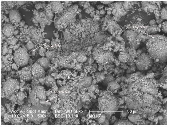 Because careful petrographic studies showed the existence of some mineral fibers in these rocks, corresponding to chrysotile, and because the increasing awareness regarding the content of asbestos in quarrying materials, we analyzed extra samples from the same quarries by SEM to clarify the major component of the serpentine phases in the rocks from Moeche. The preliminary results are compatible with all the analytical methods used to characterize the studied serpentinites: SEM shows that the major serpentine phase is antigorite (Figure 15). A small percentage is shown as lizardite, and very few fibers of chrysotile were detected, but in a small amount that could be compatible with the potential extraction of the stone. Further studies on this subject are being carried out to study the safe handling of a potential re-opening.