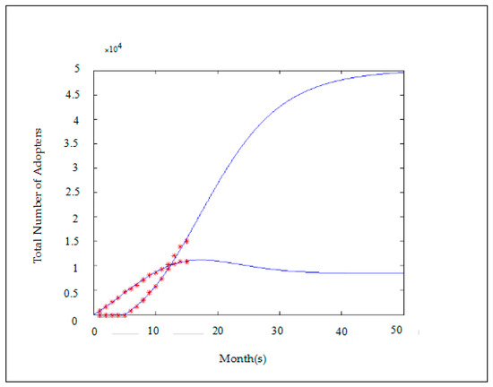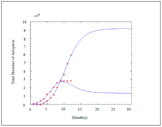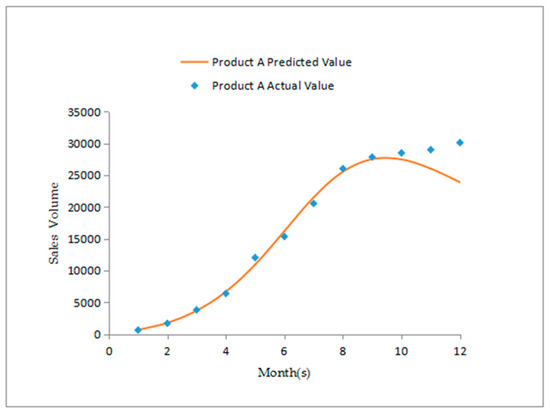 For Product B, as shown in Figure 6, after the product enters the growing and mature stages, the sales value that our model predicts is very close to the actual value with p2 < q2. Because p2 > p1 and q2 > q1, Product B is superior to Product A considering the company resources investment and the level of consumer acceptance. At the same time, α1 < α2, resistance from the conservative group becomes smaller. This result suggests that Product B is more mature than Product A is. The plot shown in Figure 6 shows that the growth curve of Product B fits well with the front part of the Bass Model and the total growth rate of the Product B adopters that our model predicts does not significantly decline, indicating that there is still room for growth.