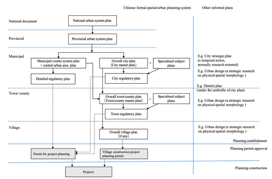 In this study, we concentrate on the complexity of planning establishment, in which plans are made at different scales: national urban system plan, provincial urban system plan, overall city plan (in parallel to municipal county system plan and central urban area plan), overall town plan, and village plan (if any). Generally, these plans express the comprehensive proposals at different administrative levels, including development goals, scales, land use structures, zoning, dominant industries, major infrastructure, and expected populations [31]. Along with these master plans, are specialized subject plans, which detail specific proposals of master plans (not always all topics) and span land use and other relevant topics, for instance, transportation, flood and sanitation calling for joint work between agents within and beyond the spatial planning system [32].