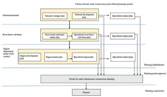 The water conservancy (and affairs) planning system focusses on water management and water affairs in contrast to, for instance, zoning or land use arrangement in spatial planning. Figure 2 illustrates the overarching framework of this system, consisting of three major processes: planning establishment, planning permit approval, and planning construction. The planning establishment is basically arranged in three layers at the national level, river basin (and sub-basin) level, and regional level (regional level in a water conservancy (and affairs) planning system is an overall concept used to describe a collective geographic territory at municipal/urban/rural/county levels, in contrast to a detached level higher than the municipal level from the perspective of spatial planning administration). National strategic plans and development plans concentrate on implementing the nationwide efforts of flood reduction, water resources utilization, ecological and environmental protection in terms of the national economy, and social development goals. At the river basin (and sub-basins) level and regional level, masterplans and development plans are compatible with the national calls and are combined with comprehensive physical and natural conditions locally, which are further detailed in specialized plans on concrete water issues including flood control, waterlogging, drought, irrigation, water supply, hydroelectric generation, water resource protection, forestation, and soil conservation.