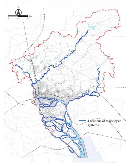 Locations of dyke systems of Guangzhou, based on the Map of Major Infrastructures in Guangzhou, exhibited in the Exhibition Museum of Guangzhou Urban Planning.