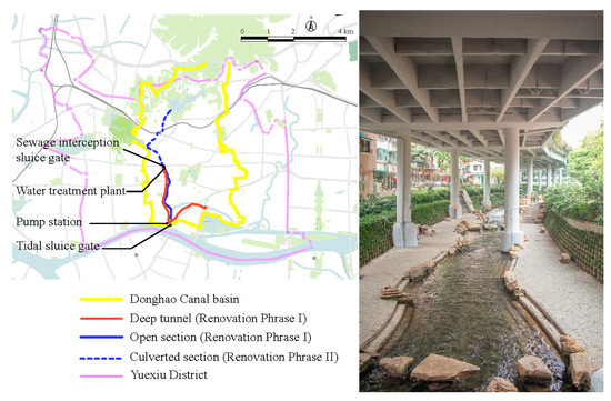 A similar subordinated position was also observed in another project-based development in Yuexiu District, Renovation of Donghao Canal (Figure 8). This project, significantly, represented a different stream of local efforts to deal with urban floods and was famous for utilizing engineering-based solutions ‘disguised’ as nature-based solutions. In the early 2000s, the tributary residential areas experienced flooded sewers in rainy seasons because of the poor capacity of Donghao canal and the conjoint sewage-drainage pipe systems (which can withstand rainfalls with recurrence periods of 3 years and less than 1 year, respectively) [48]. In addition, this project was also a regeneration practice to improve the polluted water environment in the center. Due to the polluted water released by upstream factories, the canal was then heavily spoiled. To reduce flood hazards and improve the degraded environment, the Renovation project was launched around 2010, including dredging and landscaping the canal, constructing a new deep tunnel to collect rainwater in rainy seasons, separating sewage and drainage pipe systems in nearby communities, and improving affiliated water facilitates, such as a water treatment plant, a pumping station, and several sluice gates [49].