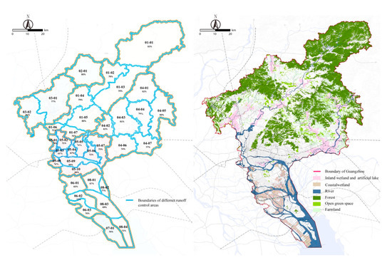 Major innovative measures for flood resilience in Guangzhou Sponge City Plan, based on Guangzhou Sponge City Plan 2010–2030 [50]. 1. (left): runoff control regulatory codes (the values presented in the map equal 1 minus the runoff coefficient); 2. (right): optimizing green–blue networks.