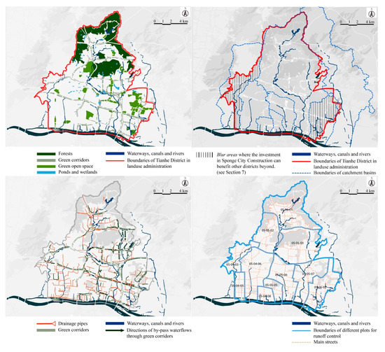 Major innovative measures for flood resilience in the Sponge City Plan for Tianhe District, based on the Sponge City Plan for Tianhe District [54]. 1. left-top: optimizing green–blue networks; 2. right-top: portraying catchment sub-basin boundaries; 3. left-bottom: organizing the excessive water flows; 4. right-bottom: setting floating regulatory codes.