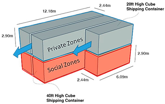 The majority of shipping containers are in standardized dimensions. Table 1 presents the basic container parameters, such as dimensions (width, length, and height), floor areas, and weight [5]. The standardized dimension makes it an ideal building component for modular and prefabricated construction projects [5]. The most popular containers used as building components are 2.438 m in width and 6.096 m or 12.192 m in length. In many national regulations, there is a minimum height limitation of 2.4 m for residential buildings. Thereby, in this context, the residential building design only consider the high cube container with total height of 2.9 m to comply with the minimum clear ceiling height building requirement. Meanwhile, the containers’ internal dimensions differ from the external ones. In fact, internal walls have a plurality of corrugations, each one 25 mm depth. This narrows the container inner width by 50 mm due to both a concave and a convex corrugation. The backside, the other side without the door, is corrugated too. The doors have a thickness of 50 mm, which results in a total loss of 75 mm in length. The height of the inner dimension is less compared with the outer dimension. Depending on the floor type, this reduction, consisting of floor clearance and thickness, is approximately 177 mm. Since roof material is also corrugated, the internal height is reduced by slightly more than 200 mm in total [5,26].