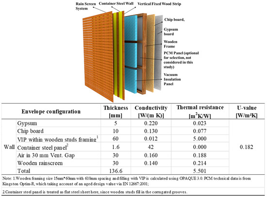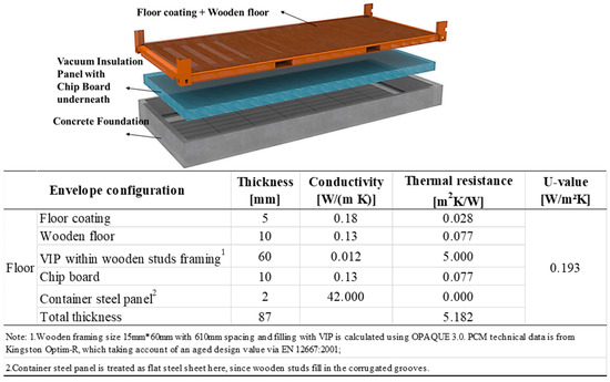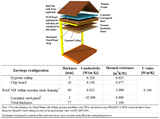 Regarding container building envelopes, the basic requirements are set with the U-values from the European Insulation Manufacturers Association’s report [28]. The scope of this paper is to propose the low U-value envelopes for container buildings, from the concept of view, in response to future climate [29]. In order to meet the generic container building design through the three different locations, each external part of the envelope with the minimum U-values has been proposed and estimated according to ISO 10456 [30], ISO 6946 [31], and manufacturing components [32,33], which are shown from Figure 4, Figure 5 and Figure 6. It can be found that the envelope design is one of the most effective strategies to increase interior insulation. Specifically, Vacuum Insulation Panels (VIP) have been used [32], providing higher thermal resistance and inner space saving with respect to conventional insulation materials. Moreover, the additional use of wood strip and wooden frame can take full advantage of the limited space on the container wall bases, offer adequate protection of vacuum insulation panels, and work as the fixed framework for interior wall panels’ installation.