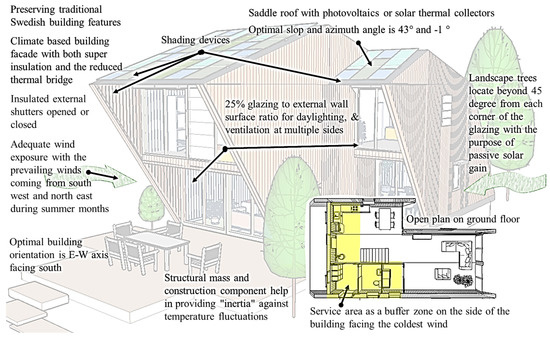 - In Stockholm, climate-based building façade should be highlighted with both super thermal insulation and the reduced thermal bridge. The external shutters should be well insulated too. Window openings shall be remained towards the prevailing wind during the summer. The optimal building orientation is necessary to be east–west axis by facing south. Structural mass needs to be implemented to reduce the indoor temperature fluctuation. Service area could act as a buffer zone, facing the coldest direction. Landscape trees should be beyond 45 degree from each corner of the glazing with the purpose of maximum passive solar gains.